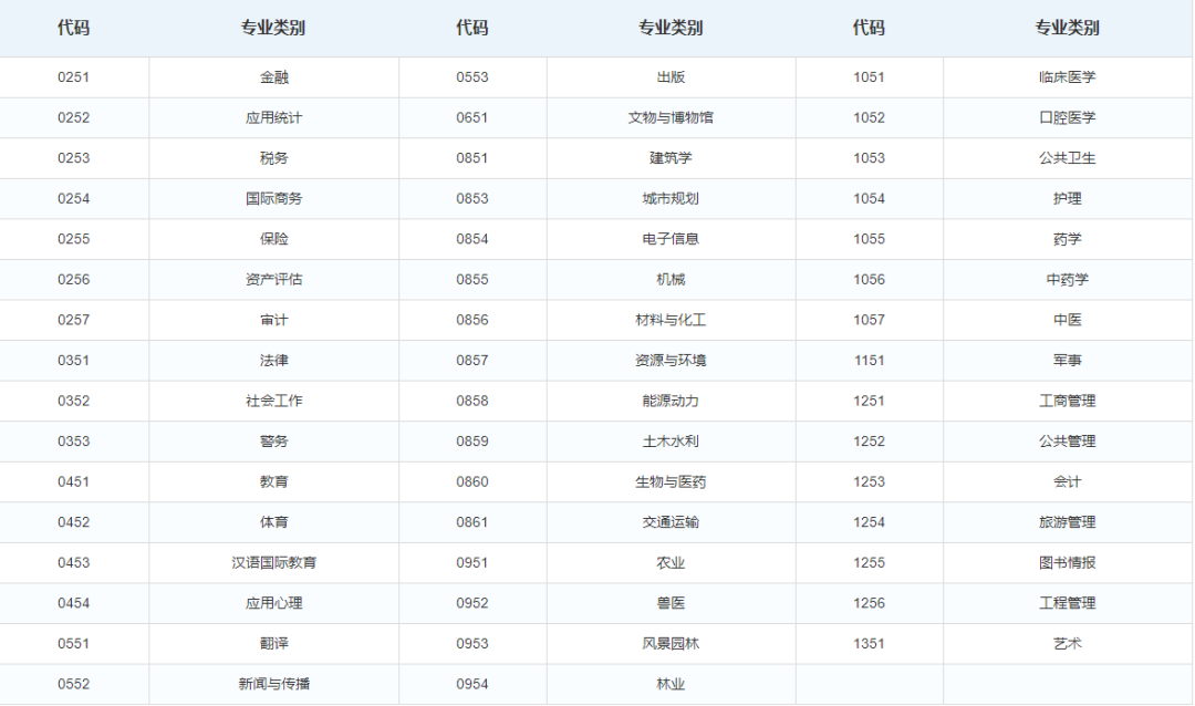专业硕士,招生专业比较有针对性,根据研招网“专业知识库”显示,“专业学位硕士研究生”招生专业包括金融、应用统计、税务、国际商务、保险、资产评估、审计、法律、社会工作、警务、教育、体育、汉语国际教育、应用心理、翻译、新闻与传播、出版、文物与博物馆、建筑学、城市规划、电子信息、机械、材料与化工、资源与环境、能源动力、土木水利、生物与医药、交通运输、农业、兽医、风景园林、林业、临床医学、口腔医学、公共卫生、护理、药学、中药学、中医、军事、工商管理、公共管理、会计、旅游管理、图书情报、工程管理、艺术等,共计47个专业。